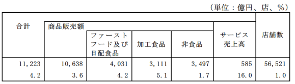 商品別ではァーストフード及び日配食品が4031億円の4.2%増、加工食品が3111億円の5.1%増、非食品が3497億円の1.7%増となったため、