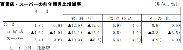 百貨店・スーパーを、既存店前年同月比でみると0.6%の増加。百貨店は7.0%減、スーパーは3.6%増となった。