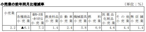 一方、各種商品小売業(百貨店など)が6.1%減、燃料小売業が0.0%の横ばいとなった。