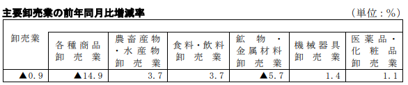 一方でマイナスだったのは、各種商品卸売業が14.9%減、衣服・身の回り品卸売業が9.6%減、繊維品卸売業が7.3%減、家具・建具・じゅう器卸売業が6.2%減、建築材料卸売業が5.9%減、鉱物・金属材料卸売業が5.7%減、化学製品卸売業が0.7%減、その他の卸売業が0.1%減となった。
