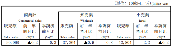 5月商業統計|商業販売額50兆円0.2%減/小売販売額12.8兆円2.2%増