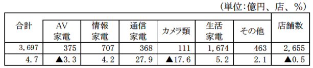 5月家電チェーン統計|販売額3697億円4.7%増/通信家電が27.9%増