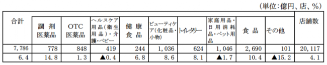 一方、その他が101億円で15.2%減、家庭用品・日用消耗品・ペット用品が1046億円で1.7%減、ヘルスケア用品 (衛生用品)・介護・ベビーが419億円で0.4%減となった。