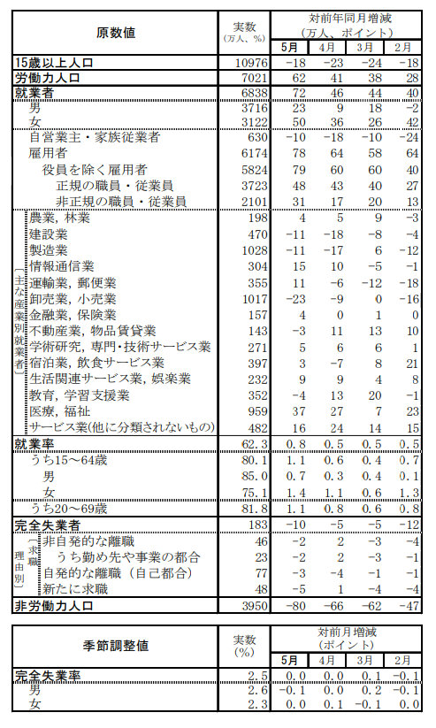 5月の就業者数は6838万人。前年同月に比べて72万人増加した。34カ月連続のプラスとなった。男女の内訳では男性が 3716万人、女性が 3122万人。就業率は62.3%、15~64歳の就業率は80.1%。