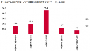 また、5kgで2000円前後という価格設定については「妥当だと思う」が46.1%と最も多く、約半数が価格を肯定的に受け止めていることが分かった。