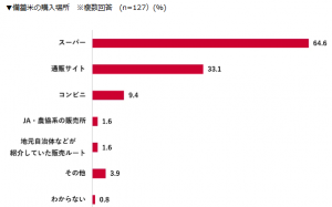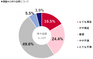 購入場所は「スーパー」が64.6%と最多で、次いで「通販サイト」が33.1%、「コンビニ」が9.4%だった。購入量は「5kg」が67.7%と最も多い。味や品質については「普通」が49.6%、「やや満足」が24.4%、「とても満足」が16.5%という結果だった。「やや不満」「とても不満」を回答した、不満を感じる人は1割未満にとどまった。