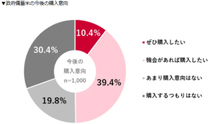今後、政府備蓄米の販売が続いた場合の購入意向を尋ねると、「機会があれば購入したい」が39.4%と最多だった。また「ぜひ購入したい」が10.4%となり、購入に前向きな回答が半数近くを占めた。一方で、「あまり購入意向はない」が19.8%、「購入するつもりはない」が30.4%と、慎重な姿勢を示す回答も目立った。