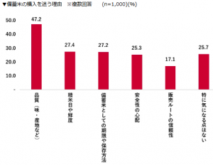 購入を迷う理由としては、「品質(味・産地など)」が47.2%と最も多く、次いで「精米日や鮮度」(27.4%)、「備蓄米としての期限や保存方法」(27.2%)が挙げられた。品質面の不安が購買行動を左右していることが明らかになった。