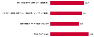 備蓄米の方が安くても、ブランド(銘柄)米を選びたいかを尋ねたところ、「安ければ備蓄米でも構わない(価格重視)」が25.7%、「できるだけ銘柄米を選びたい(価格が高くてもブランド重視)」が23.9%、「銘柄や価格よりも味や食感で選びたい」が21.5%とほぼ同じ割合となった。最多は「特にこだわりはない」の28.9%だった。