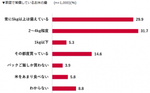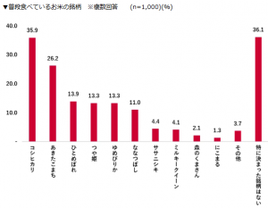 家庭で常備している米の量は「2~4kg程度」が31.7%と最も多く、「常に5kg以上は備えている」が29.9%だった。普段食べている銘柄については、「特に決まった銘柄はない」が36.1%と最多だった。具体的な銘柄では「コシヒカリ」35.9%、「あきたこまち」26.2%が上位となった。