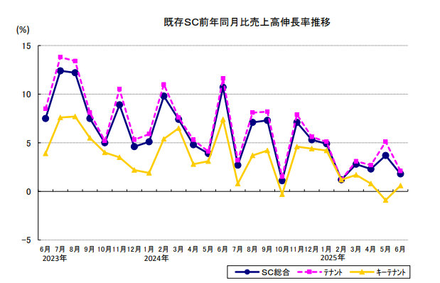 (一社)日本ショッピングセンター協会(東京都文京区、清野智会長)が2025年6月の「SC販売統計調査」を発表した。調査対象は533ショッピングセンター(SC)。