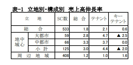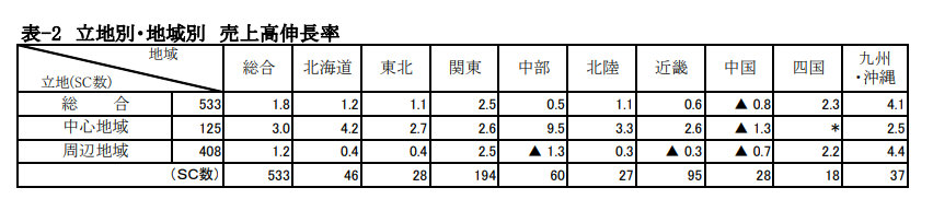 立地別に見ると、中心地域は総合で3.0%増、周辺地域は1.2%増となった。中心地域はセールなど館の販促施策が奏功し好調。また周辺地域はテナント入れ替えの効果があったSCが好調だった。