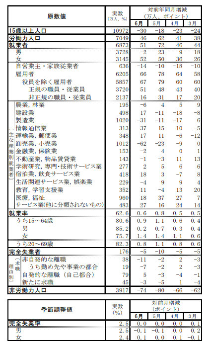 6月の就業者数は6873万人。前年同月に比べて51万人増加した。35カ月連続のプラスとなった。男女の内訳では男性が 3728万人、女性が 3145万人。就業率は62.6%、15~64歳の就業率は80.6%。