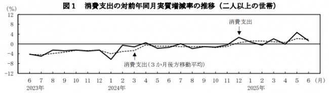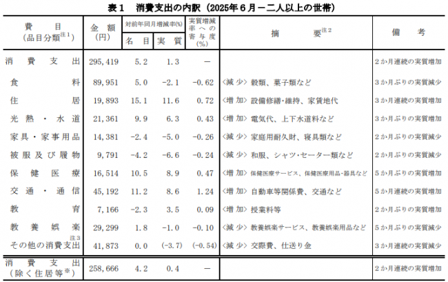 6月家計調査|消費支出1世帯当たり29.5万円で前年同月比実質1.3%増