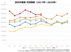 日本政府観光局(JNTO)が発表した2025年7月の訪⽇外客数は 343万7000人で、前年同月比4.4%増加した。7月としては2024年の329万2602人を14万人以上上回り、過去最高記録を更新した。