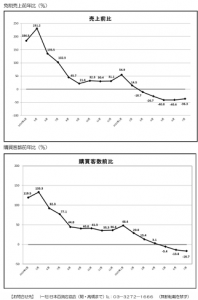 購買客数は約47万6000人で16.7%減と4カ月連続マイナス。一人当たりの購買単価も約8万4000円で23.6%減。