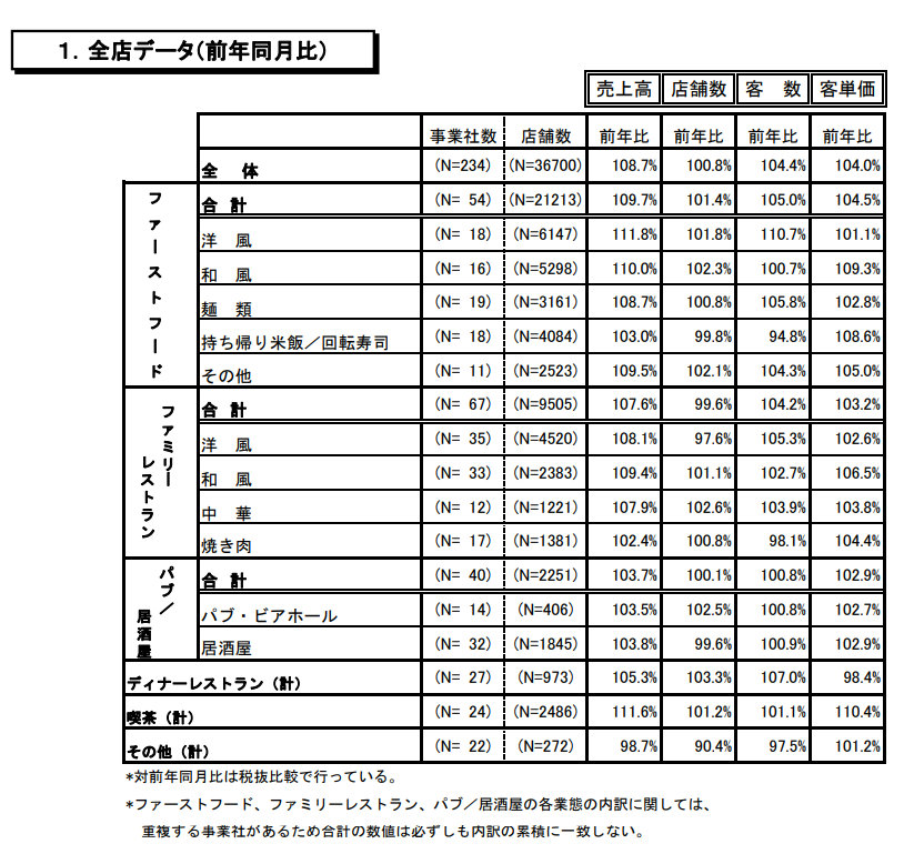 ファミリーレストラン業態の売上げは107.6%。猛暑の影響は各社まちまちだが、かき氷などの季節メニューに各社力を入れたほか、地域別の販促を展開して集客したところもあり、「洋風」は売上108.1%。「和風」は、土用の丑の日のうなぎフェアなどにより売上109.4%。「中華」は、各種キャンペーンの好調や店舗数増で、売上107.9%。一方、客数の伸び悩みが続く「焼き肉」は、猛暑が客足にマイナスとなるところもあったが、単価の上昇により102.4%となった。