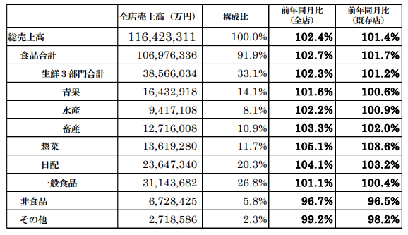 総売上高は1兆1642億3311万円で、前年同月比は全店で102.4%、既存店で101.4%だった。2023年2月以降、31カ月連続増となっている。
