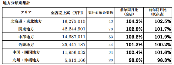エリア別では、北海道・東北地方が既存店102.5%%、関東地方が101.7%、中部地方が101.9%、近畿地方が100.2%、中国・四国地方が101.6%、九州・沖縄地方が98.3%。沖縄以外のエリアで前年をクリアした。