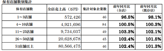 保有店舗数別では、1~3店舗が98.1%。4~10店舗は100.3%、11~25店舗は102.1%、26~50店舗が101.5%、51店舗以上が101.3%。