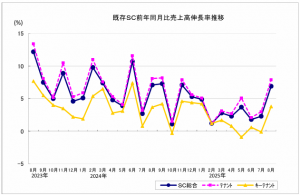 8月度の既存SC売上高は、前年同月比6.9%増。夏休みのイベント集客が奏功したほか、前年より休日日数が1日多かったこと、前年のような台風による臨時休業や時短営業がなかったことにより、前年超えとなったSCが多かった。42カ月連続で昨対プラス。