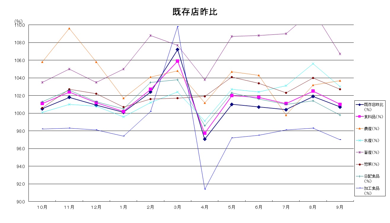 日配、一般食品、非食品、その他がマイナスで、総売上げに影響を与えたが、好調の生鮮3品のおかげでなんとかマイナス0.1の微減に留まった。