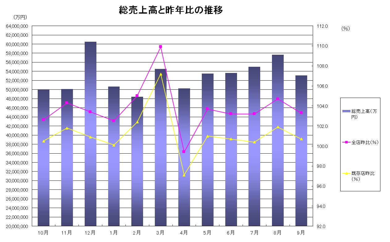 9月の総販売額は1兆0155億1450万円で既存店前年同月比はマイナス1.0%。食料品部門は6657億1141万円でマイナス0.8%、衣料品が850億4381万円でマイナス2.6%、そして住関品が2009億6606万円でマイナス1.0%だった。全部門マイナス。