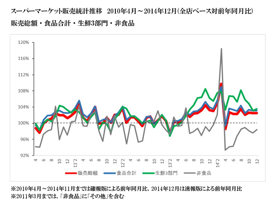 しかし、昨日スーパーマーケット3団体から発表された販売統計調査で、スーパーマーケットは唯一、既存店前年同月比プラス0.5%で2014年を終えた。スーパーマーケットのみ、プラスとなった要因はどこにあるのか。