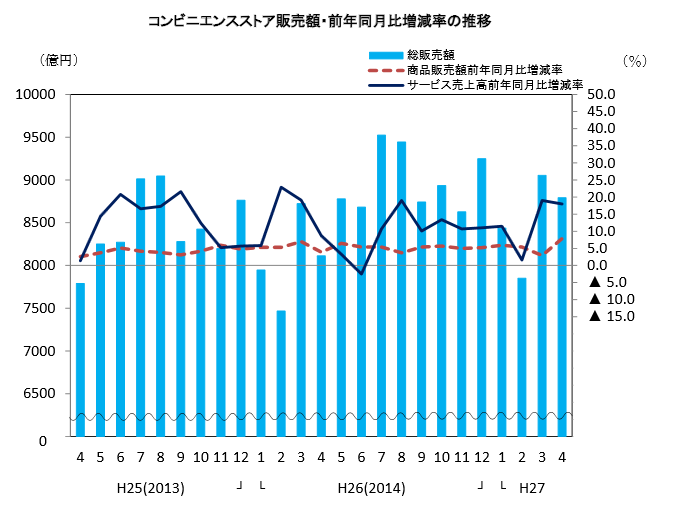 4.コンビニエンスストアの販売額は8792億円(前年同月比 プラス8.4%)。