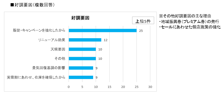 このセールに関するさまざまな意見と、上記の「好調要因」「不調要因」のアンケート表をもとに分析すると、今後のセールへの対策がみえてくる。不調要因一番の「天候要因」は避けられない項目だが、それさえも発想の転換で好調要因に変えてしまうくらいの工夫、勢いが欲しいものだ。