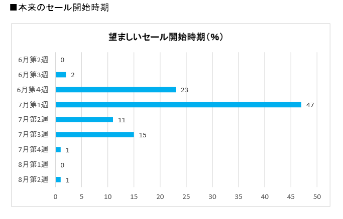 また本来好ましいと考えるセール開始時期の回答は、「7月第1週」が全体の47%で最も多く、次いで「6月第4週」が23%となった。この数字をみると来年は7月1週に集中することが予想される。