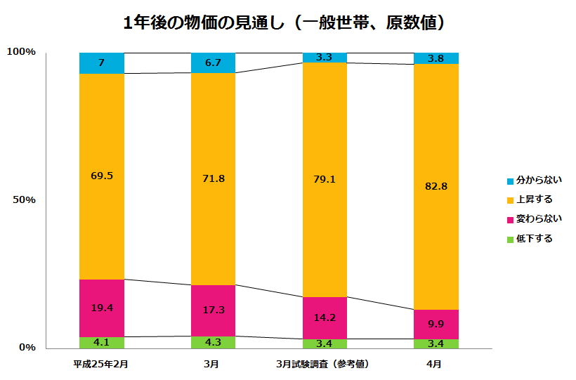 一方、一般世帯の1年後の物価に関する消費者の見通しも、