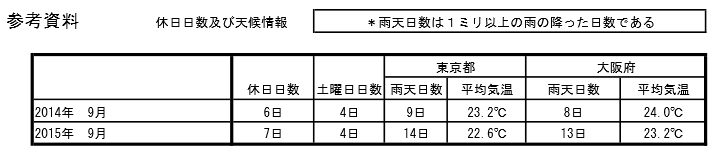 9月は前半天候不順に悩まされたが、後半はシルバーウイークの好天に助けられてプラスを計上。これは、小売業も全く同じ傾向だった。下記の表をみると、東京も大阪も昨年より雨の日が5日も多かったのがわかる。