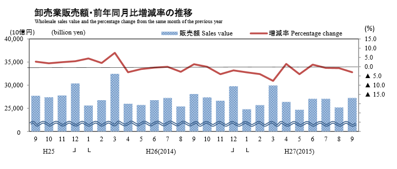 9月の統計調査の結果は、卸売業▲3.0 %、小売業▲0.2%。