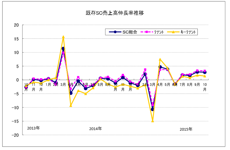 10月の既存SCの売上げは4526億1613万円で、前年同月比2.8%増。4カ月連続でプラスとなった。