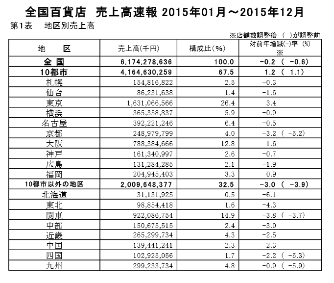 最後に、日本百貨店協会では2015年通期の売上高速報を発表している。インバウンド需要で下支えされている百貨店だが、2015年の総売上高は6兆1742億円、対前年比0.2%のマイナス。東京、大阪、福岡の百貨店だけがプラスで推移したが、他のエリアは全敗。地方百貨店の復活はほど遠い。