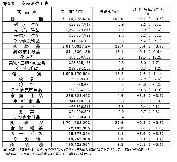 衣料品は▲5.2%だが、身の回り品7.7%、家庭用品1.4%、食料品2.4%、食堂・喫茶2.9%、雑貨6.4%とプラスを計上した。