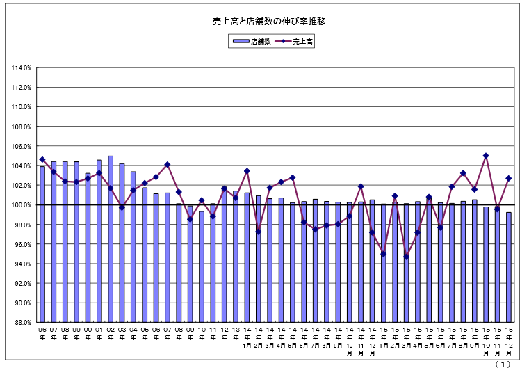 12月は暖冬により客足が良く、忘年会、クリスマス、帰省など年末需要が好調で、前年を上回り2.7%のプラスとなった。その一方で冬メニューはあまり伸びず、ファーストフードの和風メニューがマイナスとなり、また、店舗数削減が続いている居酒屋も前年を下回った。