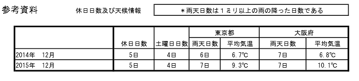 下記参考資料をみると、本当に2015年12月が暖冬だったことがわかる。平均気温が東京都は2.6℃、大阪府は3.3℃も2014年12月より高い。数字で見ると、より実感がわく。