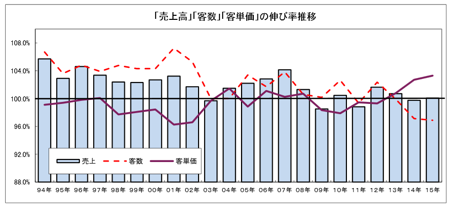 全体では2年ぶりに0.1%の増加。店舗数は0.1%増で、それがそのまま外食産業の売上げ増になった。ちなみに客数はマイナス3.1%、客単価はプラス3.3%で、単価のアップが昨年のトレンドだった。