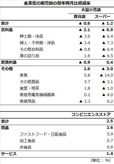 大型小売店は前年同月比▲1.0%の1兆5509億円。