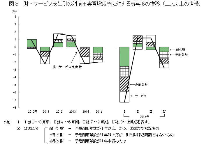 また財・サービス区分別消費支出を、年度別、および2015年を四半期別にみたのが図3である。