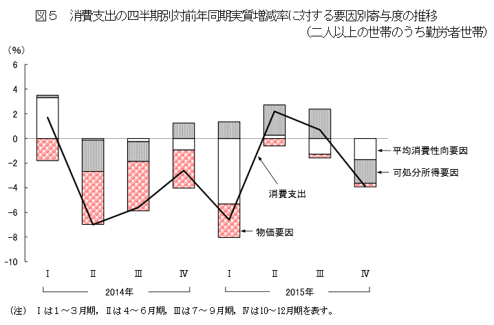 消費支出の四半期ごとの推移「物価」「可処分所得」「平均消費性向」の要因別にみたのが図5。