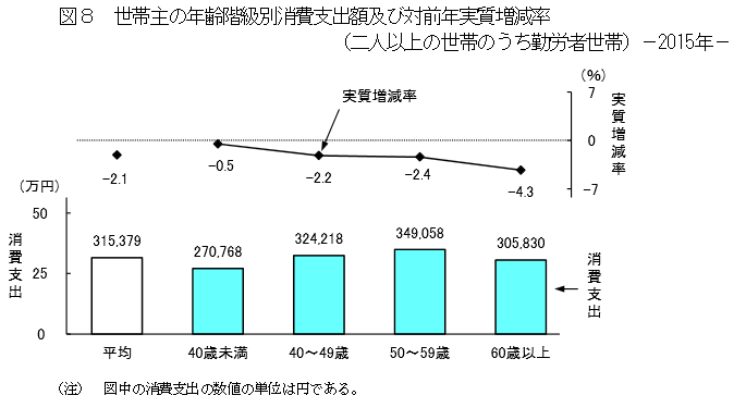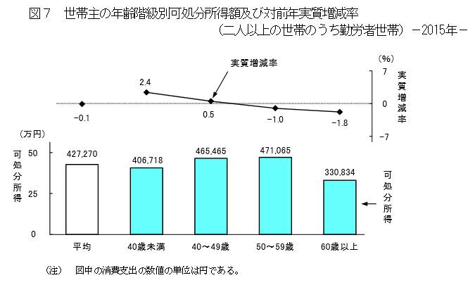 二人以上の世帯のうち勤労者世帯の可処分所得の対前年実質増減率を世帯主の年齢階級別にみると図7となる。