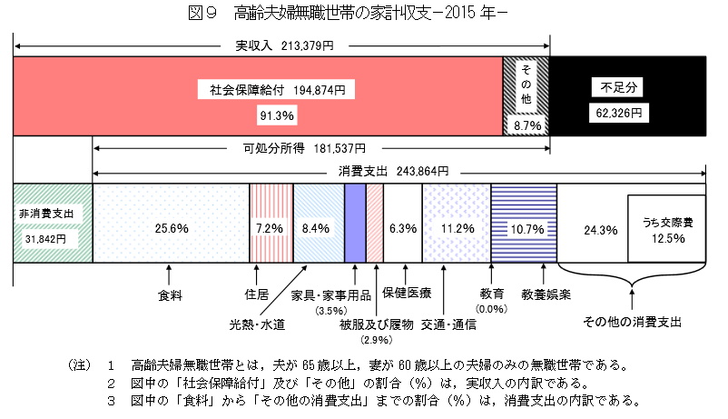 高齢夫婦無職世帯(夫65歳以上,妻60歳以上の夫婦のみの無職世帯)の実収入は21万3379円、可処分所得は18万1537円。