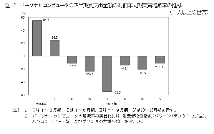 パーソナルコンピュータの支出金額の実質増減率を四半期別にみると10~12 月期まで6期連続の減少となった。その要因は、消費税率引上げに伴う駆け込み需要の反動及び、2014 年4月の Windows XP のサポート終了に伴う買い替え需要の反動である。