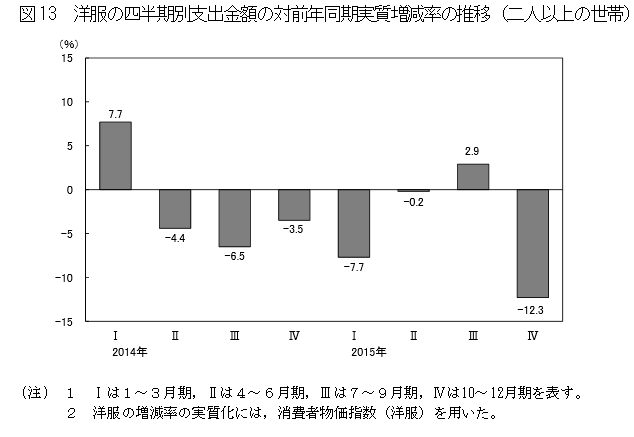 10~12月期は、11月及び12月の気温が全国的に高かった影響で、季節商品への支出が減少となり、冬物衣料を含む半耐久財や、またサービスへの支出が実質減少となった。