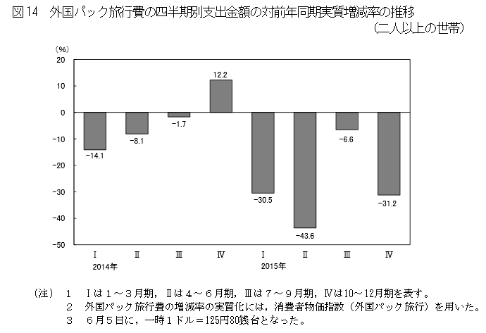 外国パック旅行費の支出金額の実質増減率を四半期別にみると、4四半期すべて前対比実質減少となった。これは、米ドル/円の為替レートが2015 年6月に 2002 年以来、約 13 年ぶりの円安水準を記録するなど、前年に比べ円安基調で推移した要因によるもの。