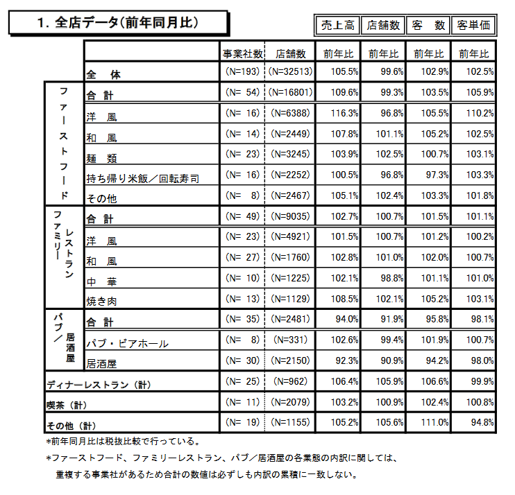 唯一マイナスだったのは、このところ不調が続いているパブ・居酒屋業態▲6.0%。これも内訳はパブが売上高2.6%プラスと健闘しているので、居酒屋が足を引っ張っている状態だ。