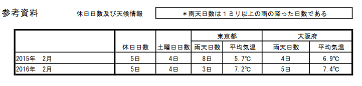 下記参考資料によると、休日日数は前年と同じ5日。東京都は雨天日数3日と前年より5日も少なかった。また平均気温は東京都は1.5℃、大阪府は0.5℃と共に前年より高かった。